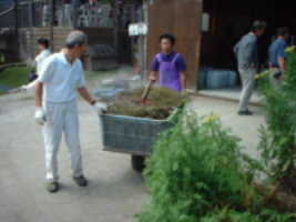 | 芳香蒸留水が出た後のラベンダーを処理するために、運んでいるところ。こちらのお兄さんは初めて運んだらしく、「この香りで具合悪くなりそうですね。」と言っていました。確かにラベンダーの香りが充満しすぎていて、ちょっと具合が悪くなりそうでした(^_^;)。 | |