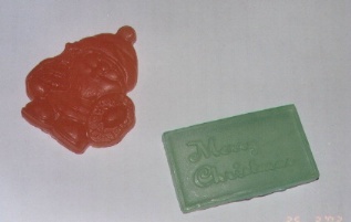 | クリスマスのグリセリンソープ by タンタンさん かわいいサンタクロースのせっけんと、Merry Christmas!の文字がはいった透明でかわいいグリセリンソープ。 モルドで型抜きし、緑色の方には「オーシャン・レイン」、赤色には「ストロベリー」のフレグランスオイルを入れられたそうです! 管理人が頂いたのですが、とてもかわいくて使えない(^_^;)です。 |