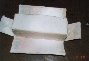 型からとりだしてみた。やっぱり早く出しすぎたのか、型にべっちょり石鹸がついてしまい、四角い型がイビツになってしまった。やっぱり、本のとおりに5日くらい待たないとダメなのか。それとも、植物性ギーの違いなのか....