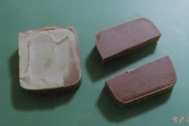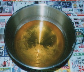 苛性ソーダと精製水を混ぜたものを、41度までさげていたのだが、50度くらいで、みつろうのほうが先に固まってしまうので、結局、油53度、苛性ソーダと精製水を合わせたものを、41度で混ぜました。こんなに温度差があって大丈夫なのでしょうか。とても不安です。最後の温度は41度でした。今のところ、うまくかたまっています。