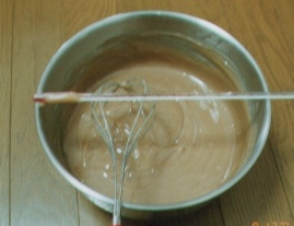 それから、ココアの量を少し控えたので、コーヒー色です。香りをいれないと生臭い香りがするとのことだったので、スィートアーモンドのエッセンシャルオイルを56滴いれました。