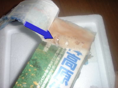あ゛〜っ、そのまま絶叫したいです。まず不気味だったのは、牛乳パックの上に油が浮いていたこと。そして、牛乳パックをめくればめくるほど、陥没部分から油がでてくるのです(矢印)。いや、この時はまだよかった。なにしろまだ油っぽい油でしたから。そして、悲劇はこの後に....