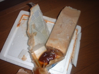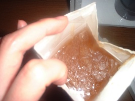 オー!アメイジング!牛乳パックをはがせばはがすほどあふれる茶色の液体。そして、底にはゼリー状の物体。さらに、底は昆虫の卵のような粒が一杯。大切な保存箱も、どろどろの油の液体まみれです。これは何?確かに触ると牛乳のマズくなった香り(いや、匂いというべきでしょう)がします。もう匂いとショックで具合が悪くなりそうです。