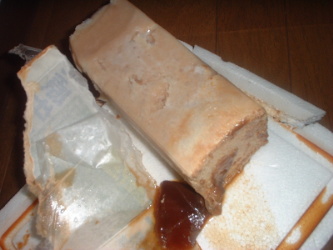 去年からまったくレポートを作っていなかったせっけん。この間に4回くらいせっけんを作っていたのですが、製作記を書いていませんでした。それがたたったのでしょうか。今、私の家では悪夢が起きています。せっけん製作以来初めての大失敗!。いやいや、さわるとクサいし、怪しい液体がどろどろと流れでてくるし....せっけんらしくなく、陥没しているし...つらすぎます。ちょっとせっけんを作る意欲が薄れております。日付が”頃”となっておりますが、このせっけんを作った直後、のろわれたように手帳をなくし、日にちがわからなくなってしまいました。でも、確かにこの頃作りましたので、ご了承頂けたらと思います。