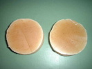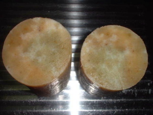 塩ビパイプのほうはまだ型だしできない状態です(^_^;)。冷凍庫にいくらいれても出てこない(^_^;)。一体。一方プリングルスの型から出したせっけんは、不思議な感じ...です。それに、やっぱりくさいんです。