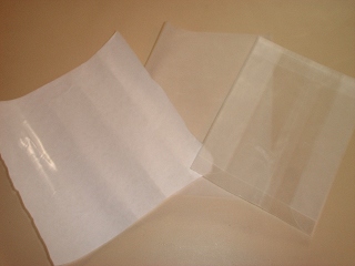 (左)フリーザーペーパー<Reynolds Freezer Paper>→ワックスコーティング(表はコーティングされていますが裏は紙です) (中央)リードホットクッキングシート→グラシン紙、シリコーン樹脂<両面シリコン加工> (右)ワックスペーパー→食品包装用パラフィン紙(ロウでのコーティング)<ジェリーフィッシュ社販売のもの> 写真中央のリードホットクッキングシートと、写真右のワックスペーパーの材質にあまり違いを感じられませんでした。(あくまでも管理人の主観ですが) |